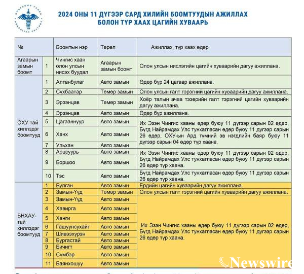 ХИЛИЙН БООМТУУДЫН 2024 ОНЫ 11 ДҮГЭЭР САРД АЖИЛЛАХ БОЛОН ТҮР ХААХ ЦАГИЙН ХУВААРИЙГ танилцуулж байна.