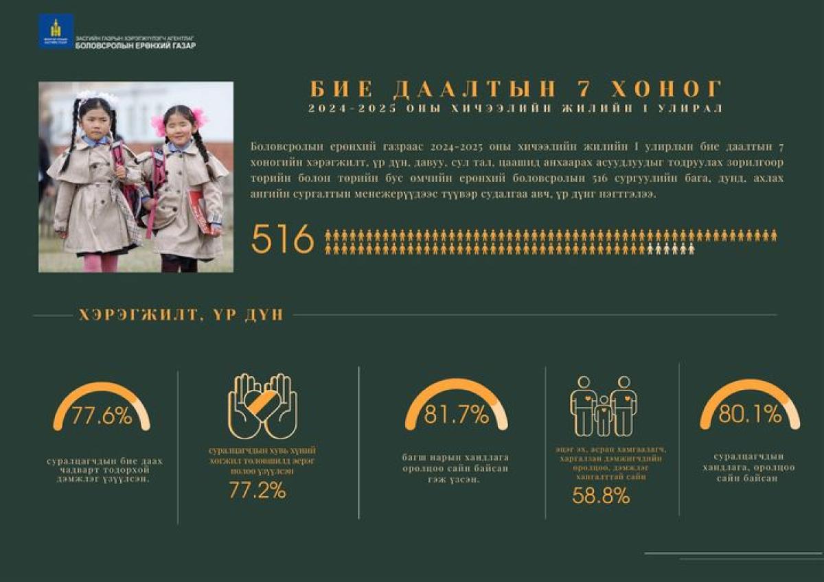 Боловсролын ерөнхий газраас 2024-2025 оны хичээлийн жилийн I улирлын бие даалтын 7 хоног (10 дугаар сарын 28-ны өдрөөс 11 дүгээр сарын 1-ний өдрүүдэд)-ийн хэрэгжилт, үр дүн, давуу, сул тал, цаашид анхаарах асуудлуудыг тодруулах зорилгоор төрийн болон төрийн бус өмчийн ерөнхий боловсролын 516 сургуулийн бага, дунд, ахлах ангийн сургалтын менежерүүдээс түүвэр судалгаа авч, үр дүнг нэгтгэлээ.