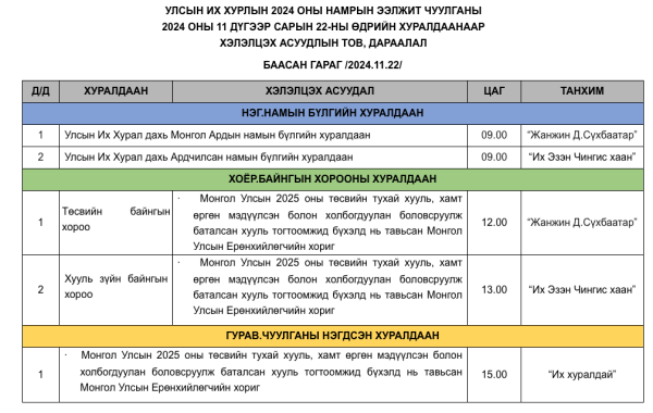 УЛСЫН ИХ ХУРЛЫН 2024 ОНЫ НАМРЫН ЭЭЛЖИТ ЧУУЛГАНЫ 2024 ОНЫ 11 ДҮГЭЭР САРЫН 22-НЫ ӨДРИЙН ХУРАЛДААНААР ХЭЛЭЛЦЭХ АСУУДЛЫН ТОВ, ДАРААЛАЛ