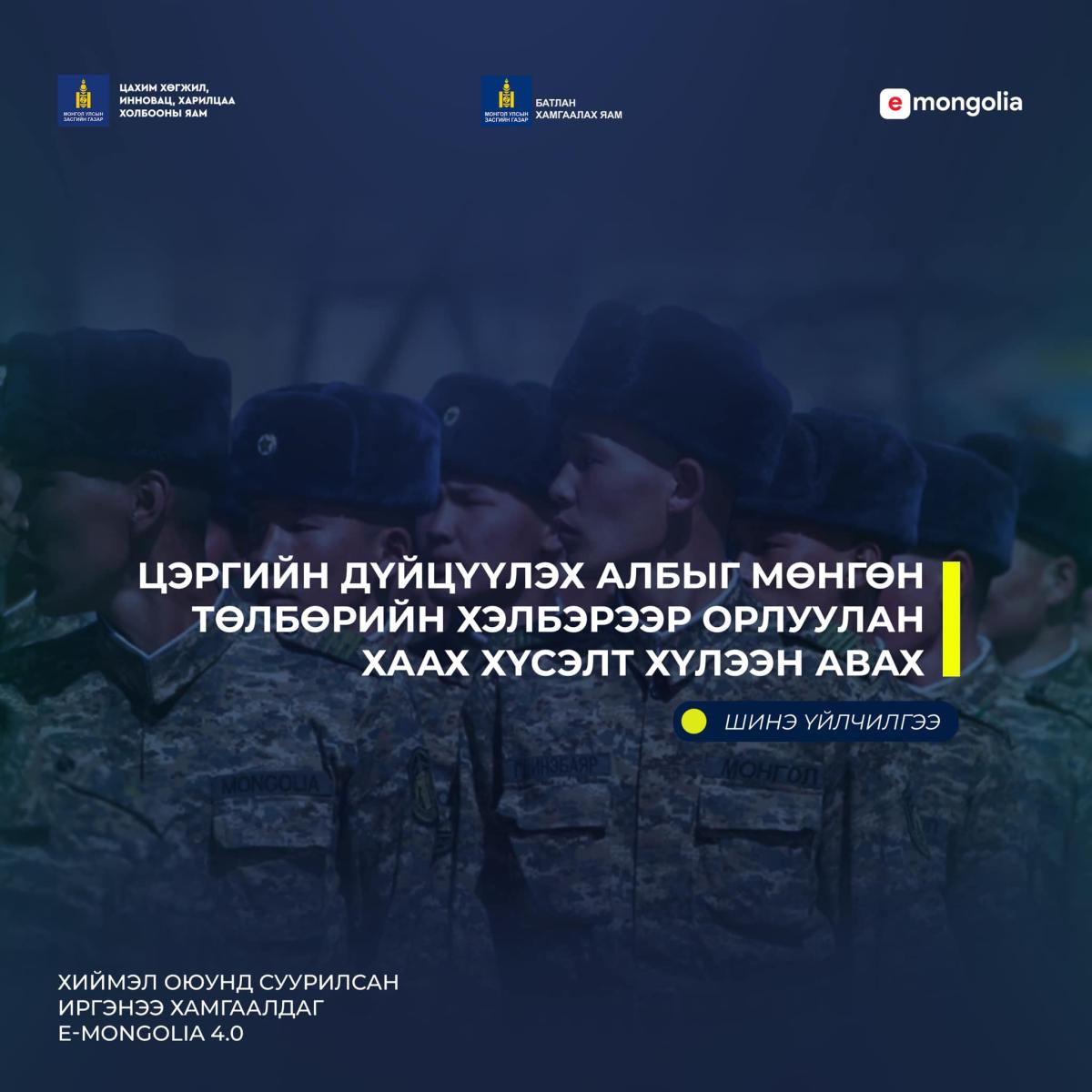 “И-Монгол академи” УТҮГ нь Батлах хамгаалах яам, НЗДТГ-ын Цэргийн штабтай хамтран Цэргийн дүйцүүлэх албыг мөнгөн төлбөрийн хэлбэрээр орлуулан хаах хүсэлтийг хүлээн авах үйлчилгээг цахимжууллаа. Үйлчилгээг авахын тулд “E-Mongolia” системд өөрийн бүртгэлээрээ нэвтрэн орж хайлтын хэсэгт “Цэргийн дүйцүүлэх албыг мөнгөн төлбөрийн хэлбэрээр орлуулан хаах хүсэлт” үйлчилгээний нэрийг оруулан хайлт хийснээр цахимаар хүсэлтээ илгээх боломжтой юм. Үйлчилгээ авах линк: