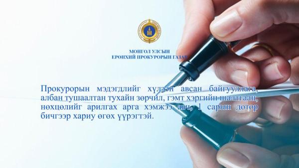 Прокурорын мэдэгдлийг хүлээн авсан байгууллага, албан тушаалтан тухайн зөрчил, гэмт хэргийн шалтгаан, нөхцөлийг арилгах арга хэмжээ авч, 1 сарын дотор бичгээр хариу өгөх үүргийг хуулиар хүлээдэг байна.