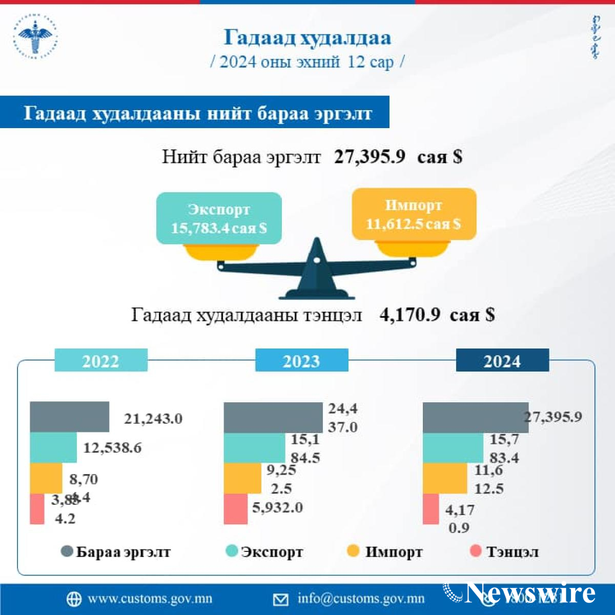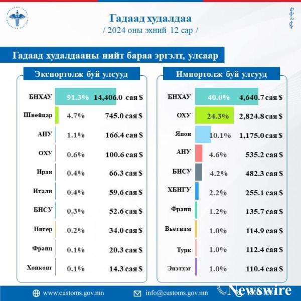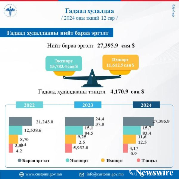 2024 оны эхний 12 сарын дүнгээр гадаад худалдааны нийт бараа эргэлт 27,395.9 сая ам.доллар болж 2023 оны мөн үеэс 2958.9 сая ам.доллар буюу 12.1 хувиар өсчээ.