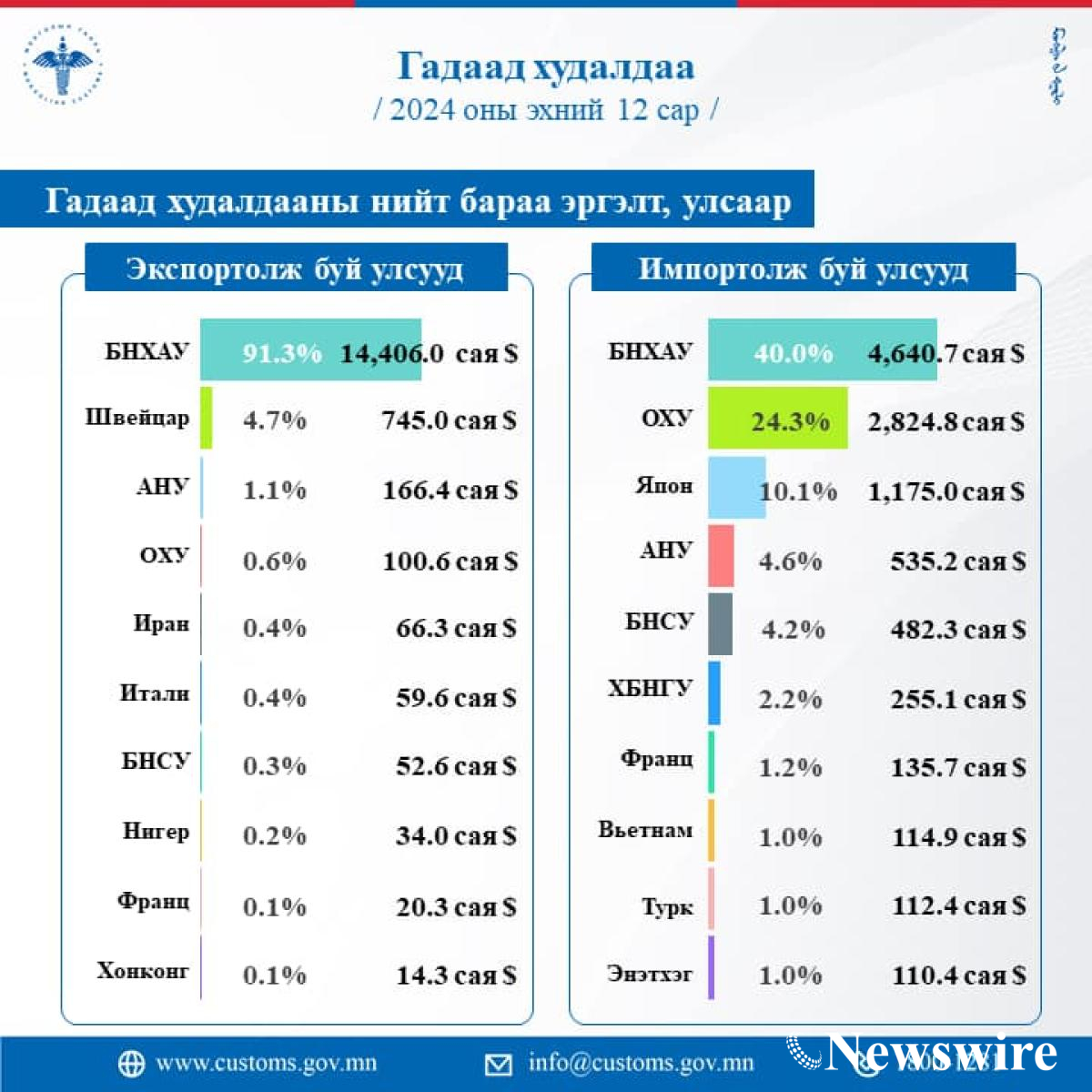 Экспортын дүн импортын дүнгээс 4170.9 сая ам.доллараар давж, гадаад худалдааны баланс эерэг гарлаа.