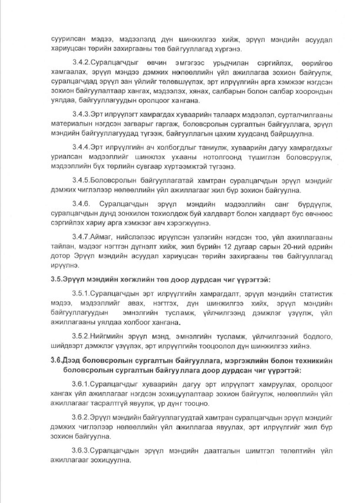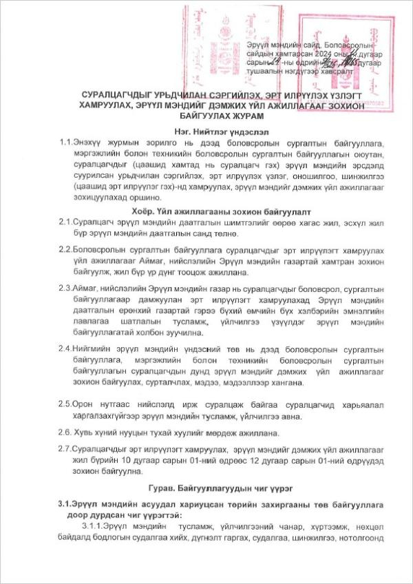 Эрүүл мэндийн сайд, Боловсролын сайдын хамтарсан тушаалаар "Суралцагчдыг урьдчилсан сэргийлэх, эрт илрүүлэх үзлэгт хамруулах, эрүүл мэндийг дэмжих үйл ажиллагааг зохион байгуулах тухай" журмыг баталлаа. Энэхүү шинэчлэгдсэн журам хэрэгжиж эхэлснээр орон нутгаас нийслэлд ирж суралцаж буй оюутнууд харьяалал харгалзахгүйгээр эрүүл мэндийн тусламж, үйлчилгээ авах боломжтой болж байна.