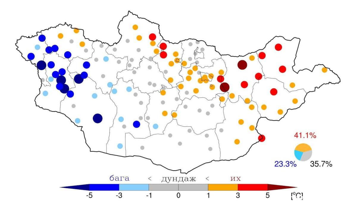 Монгол орны нийт нутгийн 23.3% нь дунджаас -1.0°С -ээс -7.0°С-аар хүйтэн, 41.1% нь дунджаас +1.0°С –ээс 5.3°С-аар дулаан, 35.7% нь дунджийн орчим байжээ.
