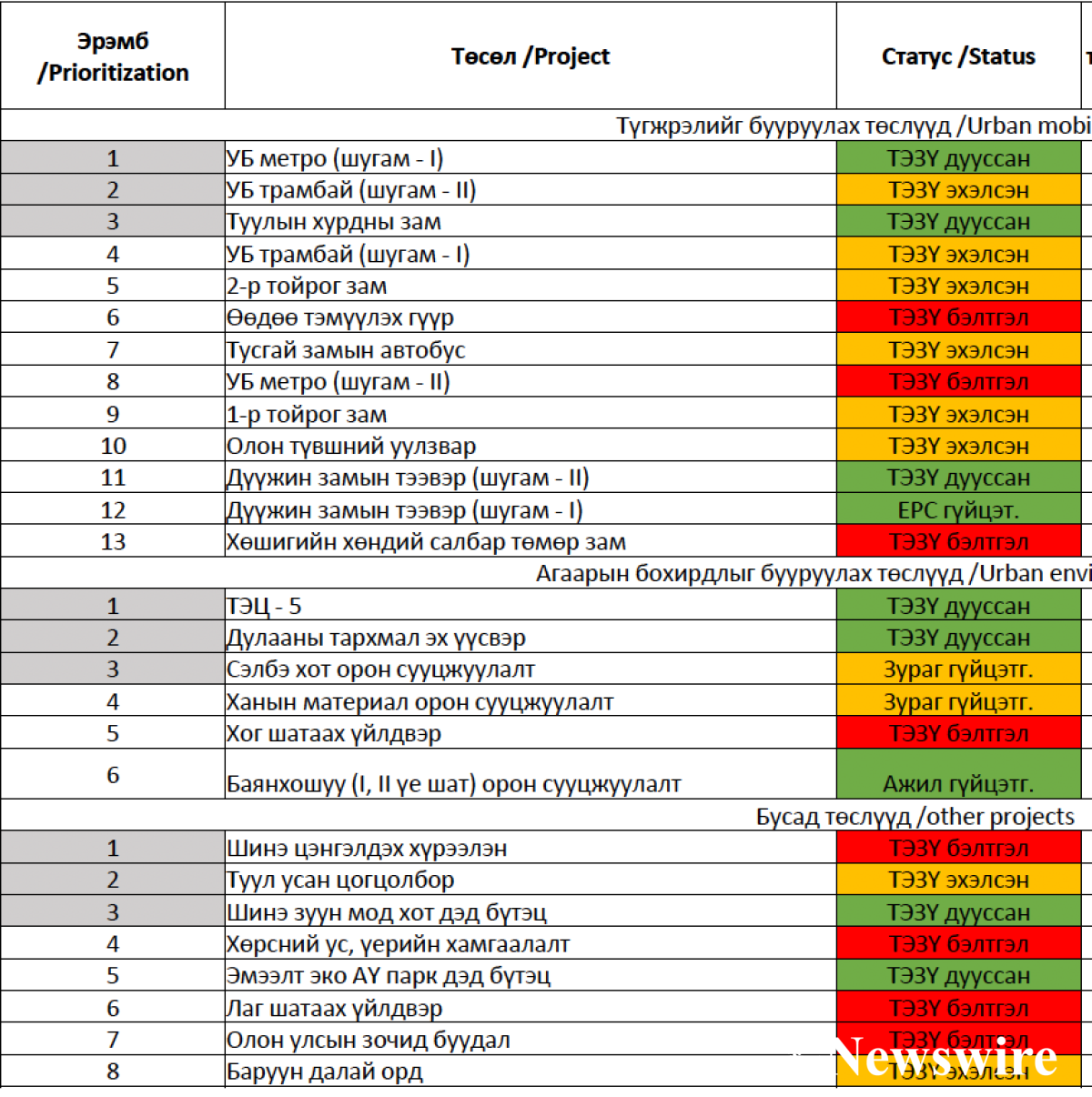 Нийслэл Улаанбаатар хотын агаар, орчны бохирдол, авто замын түгжрэл, иргэдийн амьдралын чанарыг дээшлүүлэх зорилтын хүрээнд хэрэгжүүлэх мега төслүүдийг эрэмбэллээ.