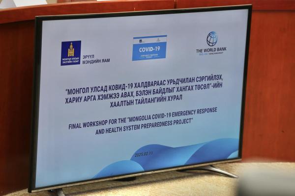 Дэлхийн банкны санхүүжилттэй ЭМЯ-ны хэрэгжүүлж буй “Монгол Улсад КОВИД-19 халдвараас урьдчилан сэргийлэх, хариу арга хэмжээ авах, бэлэн байдлыг хангах төсөл” нь 2020-2025 онд хэрэгжиж өнөөдөр хаалтын тайлангийн хурлаа хийж байна.