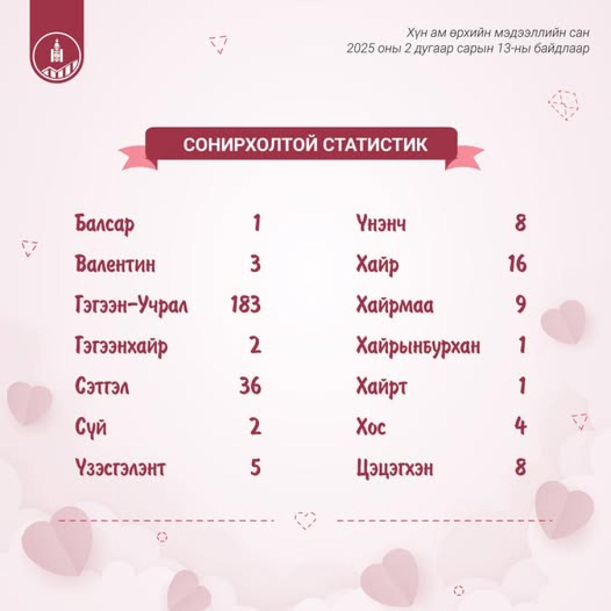 Үндэсний статистикийн хорооноос Гэгээн хайрын өдөрт зориулсан сонирхолтой статистик танилцуулжээ.
