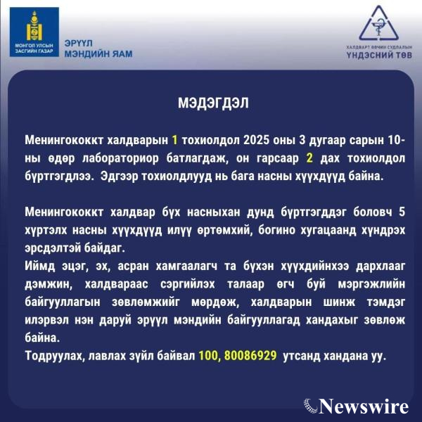 Менингококкт халдварын нэг тохиолдол 2025 оны 3 дугаар сарын 10-ны өдөр лабораториор батлагдаж, он гарсаар хоёр дах тохиолдол бүртгэгдлээ.