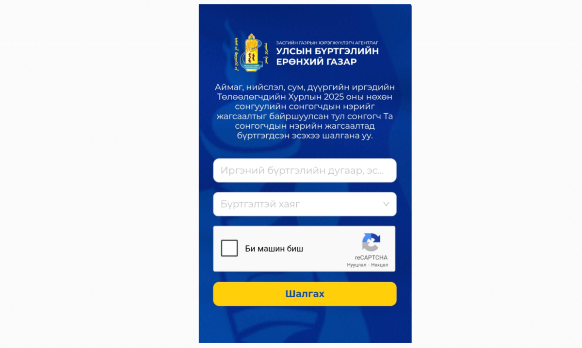 Сонгогч та ЭНД ДАРЖ сонгогчдын нэрийн жагсаалт дахь өөрийн мэдээллээ шалгана уу. Тодруулбал, Улсын бүртгэлийн ерөнхий газрын https://burtgel.gov.mn/ цахим хуудсанд хандаж, “Аймаг, нийслэл, сум, дүүргийн иргэдийн Төлөөлөгчдийн Хурлын 2025 оны нөхөн сонгуулийн сонгогчдын нэрийн жагсаалт” цонхыг идэвхжүүлэн иргэний бүртгэлийн дугаар /РД дугаар/, бүртгэлтэй хаягийн мэдээллээ оруулан шалгах боломжтой.
