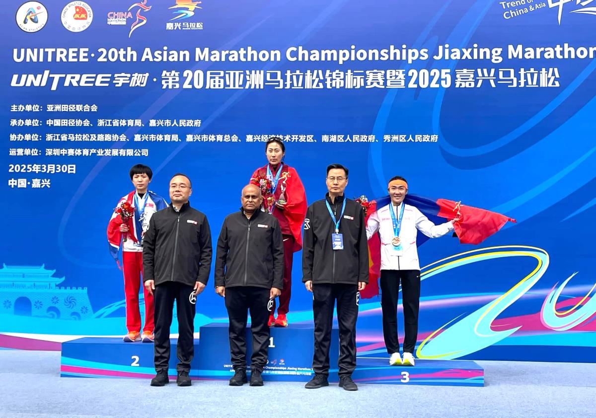 БНХАУ-ын Жайшинг хотод 42 км-ын марафон гүйлтийн Ази тивийн аварга шалгаруулах тэмцээн гуравдугаар сарын 30-нд болоход 18 орны нийт 54 (эрэгтэй 34, эмэгтэй 20) тамирчин өрсөлдлөө. 20 дахь удаагийн энэ тэмцээнд манай улсаас дасгалжуулагч Б.Доржпаламын удирдлага дор дөрвөн тамирчин оролцсоноос эмэгтэйчүүдийн ангилалд Г.Хишигсайхан 2:28.56 цагийн амжилтаар хүрэл медаль хүртсэн бол эрэгтэйчүүдээс хамгийн өндөр амжилтыг гавьяат тамирчин Б.Сэр-Од (VI байр) /2:15:13/ үзүүлжээ.