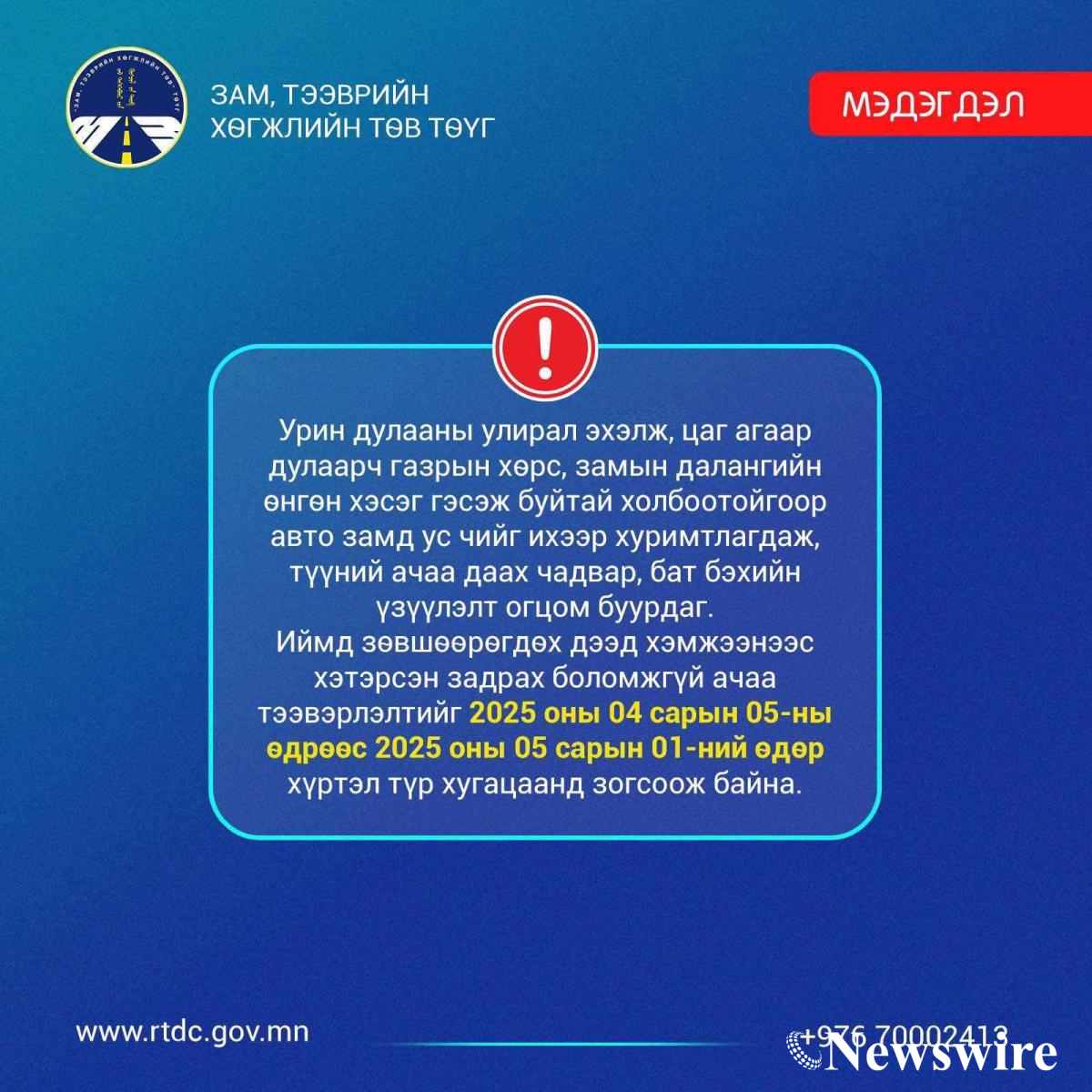 Иймд зөвшөөрөгдөх дээд хэмжээнээс хэтэрсэн задрах боломжгүй ачаа тээвэрлэлтийг 2025 оны 04 дүгээр сарын 05-ны өдрөөс 2025 оны 05 дугаар сарын 01-ний өдөр хүртэл түр хугацаанд ЗОГСООЖ байна гэж Зам тээврийн хөгжлийн төв ТӨҮГ-аас мэдээллээ.