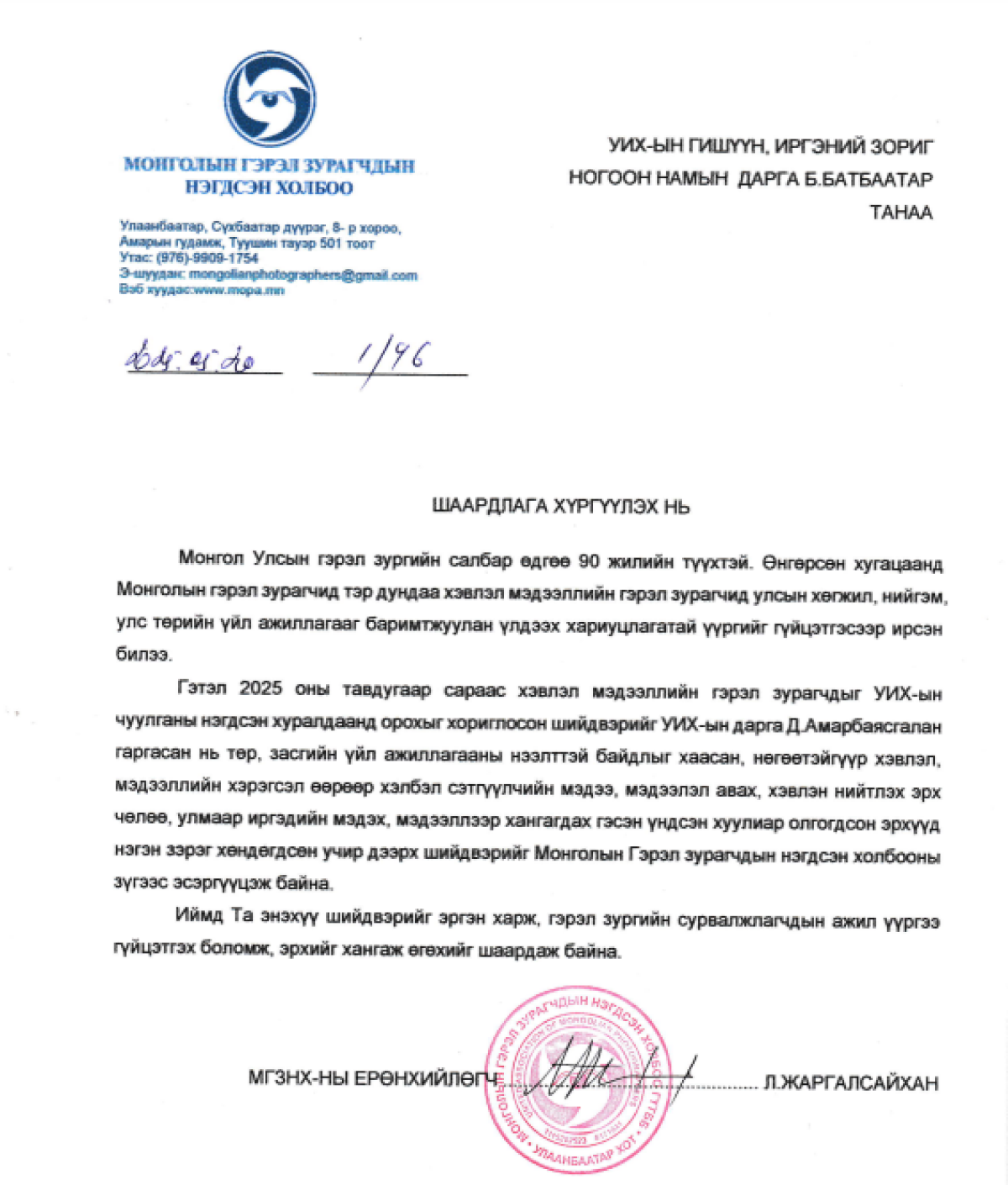 МГЗНХ-НЫ ЕРӨНХИЙЛӨГЧ Л.ЖАРГАЛСАЙХАН