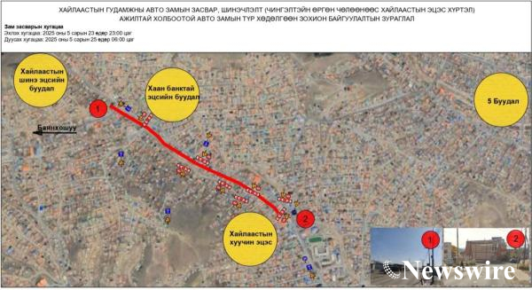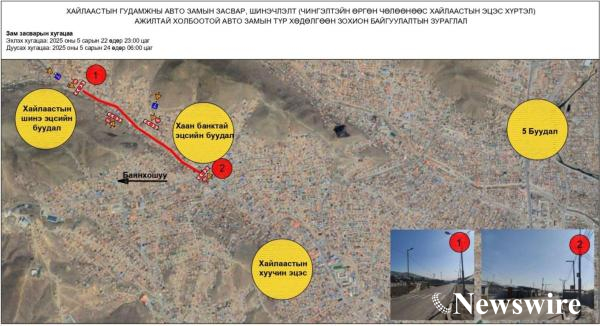 Чингэлтэй дүүргийн 13, 15, 16 дугаар хороо, Чингэлтэйн өргөн чөлөөнөөс Хайлаастын эцэс хүртэл 4 км авто замыг гурван хэсэгт хэсэгчлэн хааж, шинэчилнэ. Тодруулбал, тавдугаар сарын 22-ны 23:00 цагаас 26-ны 06:00 цагийн хооронд хааж, хэсэгчлэн хааж, засварлана.