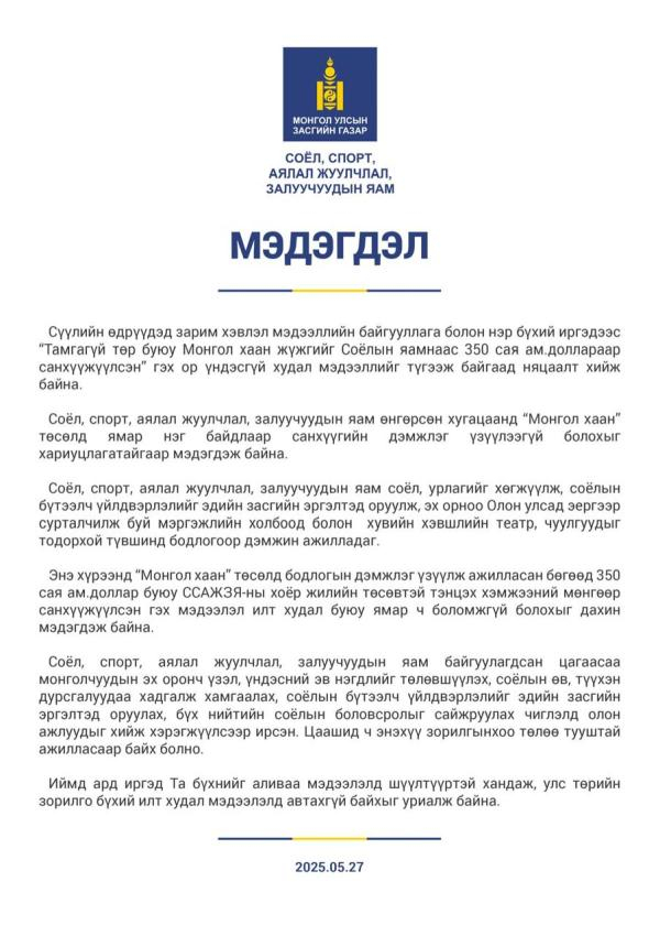 Соёл, спорт, аялал жуулчлал, залуучуудын яам өнгөрсөн хугацаанд “Монгол хаан” төсөлд ямар нэг байдлаар санхүүгийн дэмжлэг үзүүлээгүй болохыг хариуцлагатайгаар мэдэгдэж байна.