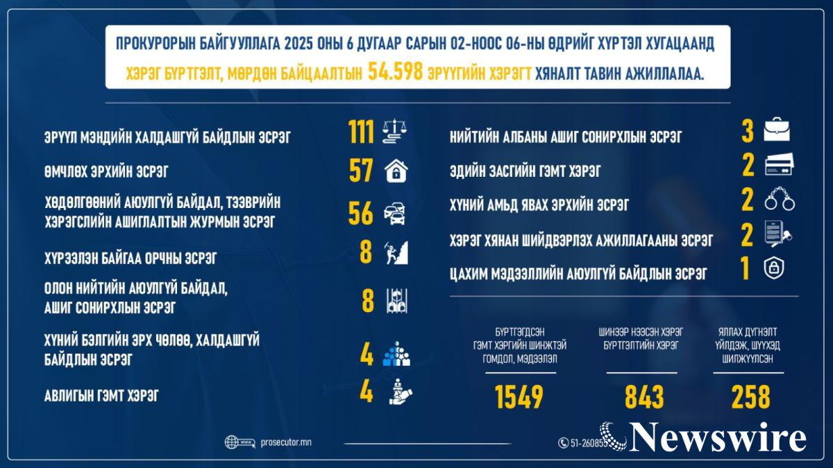 Прокурорын байгууллага 2025 оны 6 дугаар сарын 02-ноос 06-ны өдрийг хүртэл хугацаанд хэрэг бүртгэлт, мөрдөн байцаалтын 54598 эрүүгийн хэрэгт хяналт тавин ажиллалаа.