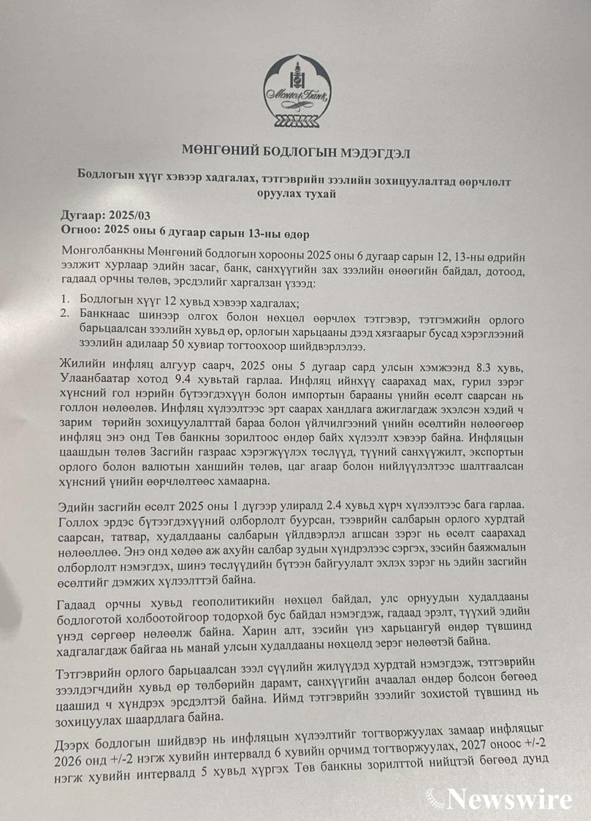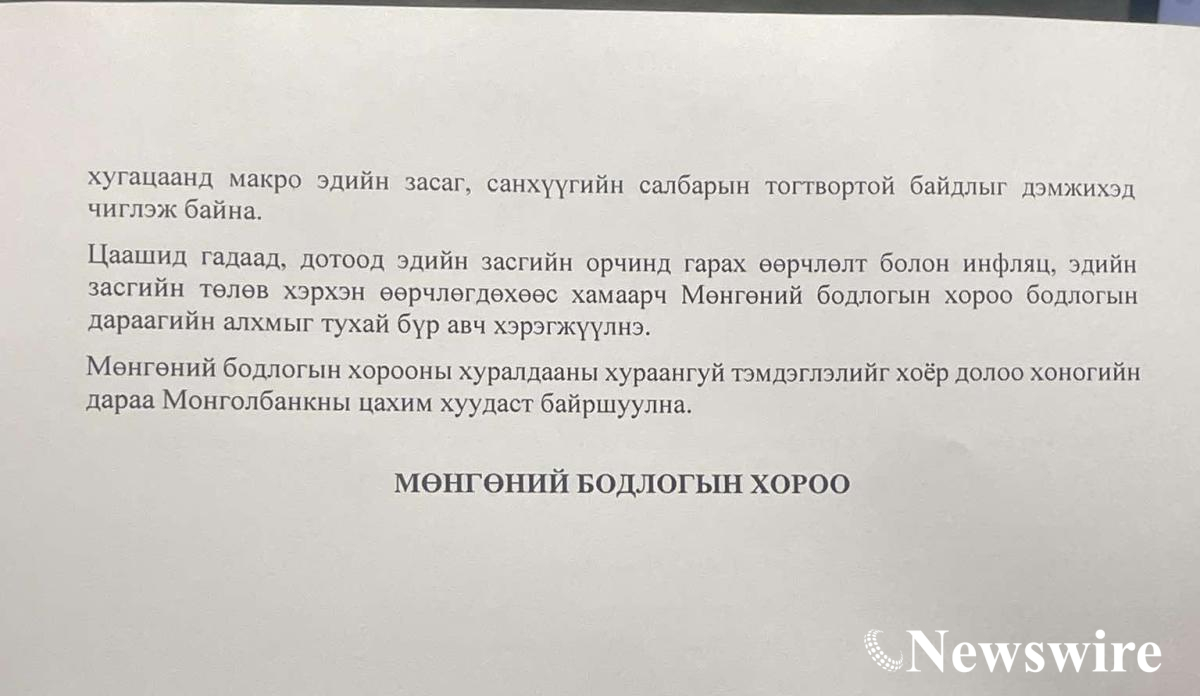 Монголбанк Мөнгөний бодлогын хорооны шийдвэрийг танилцууллаа.