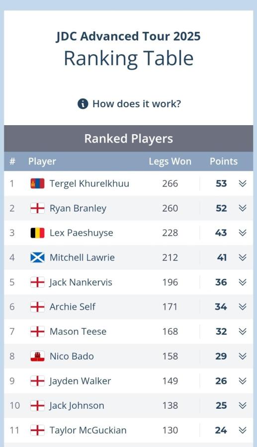 Их Британийн нийслэл Лондон хотод дартсын өсвөр үеийнхний "ADVANCED TOUR-2025" дэлхийн лигийн тэмцээн энэ оны нэгдүгээр сараас эхэлж, өчигдөр дүнгээ гаргалаа. Зөвхөн 16 хүртэлх насныхан оролцдог 20 цуврал тэмцээний нийлбэр дүнгээр Монгол Улсын тамирчин, 14 настай Х.Тэргэл тэргүүн байр эзэлж, дэлхийн чансааг мөн тэргүүлэв.