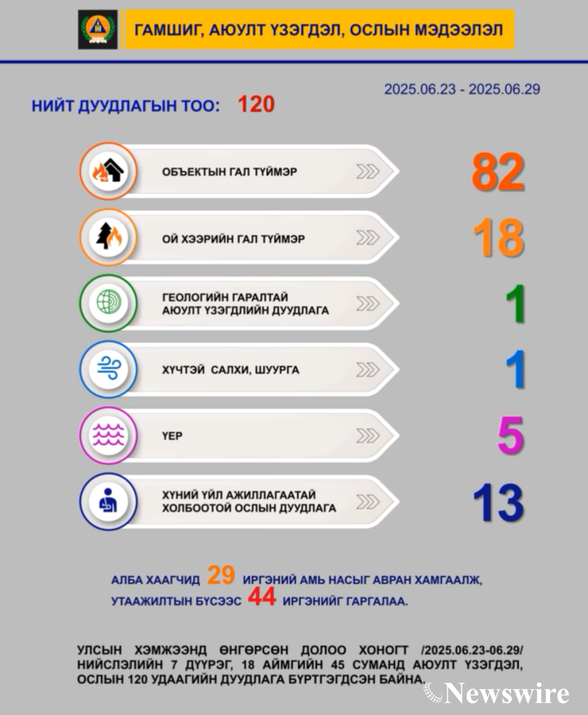 Улсын хэмжээнд өнгөрсөн долоо хоногт /2025.06.23-06.29/ нийслэлийн 7 дүүрэг, 18 аймгийн 45 суманд аюулт үзэгдэл, ослын 120 удаагийн дуудлага бүртгэгдсэн байна.