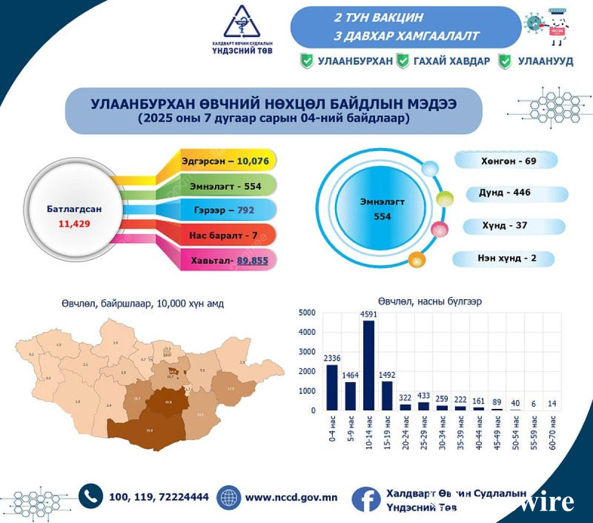 Халдварт өвчин судлалын үндэсний төвөөс гаргасан мэдээллээр, 2025 оны долдугаар сарын 4-ны байдлаар улаанбурхан өвчний нийт батлагдсан тохиолдол 11429 хүрээд байна.