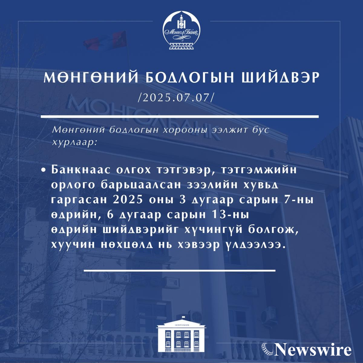 Монголбанкны Мөнгөний бодлогын хорооны 2025 оны 7 дугаар сарын 7-ны өдрийн ээлжит бус хуралдаанаар банкнаас олгох тэтгэвэр, тэтгэмжийн орлого барьцаалсан зээлийн хувьд гаргасан 2025 оны 3 дугаар сарын 7-ны өдрийн, 6 дугаар сарын 13-ны өдрийн шийдвэрийг хүчингүй болгож, хуучин нөхцөлд нь хэвээр үлдээлээ.