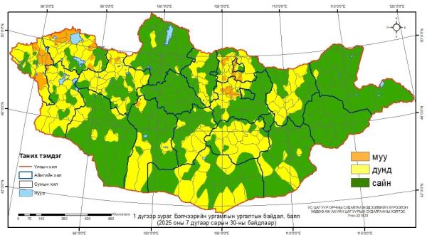 Цаг уурын байгууллагаас гаргасан бэлчээрийн ургамлын ургалтын байдал долоодугаар сарын 30-ны байдлаар нийт нутгийн 38 хувьд гантай болон гандуу, 62 хувьд хэвийн байна.