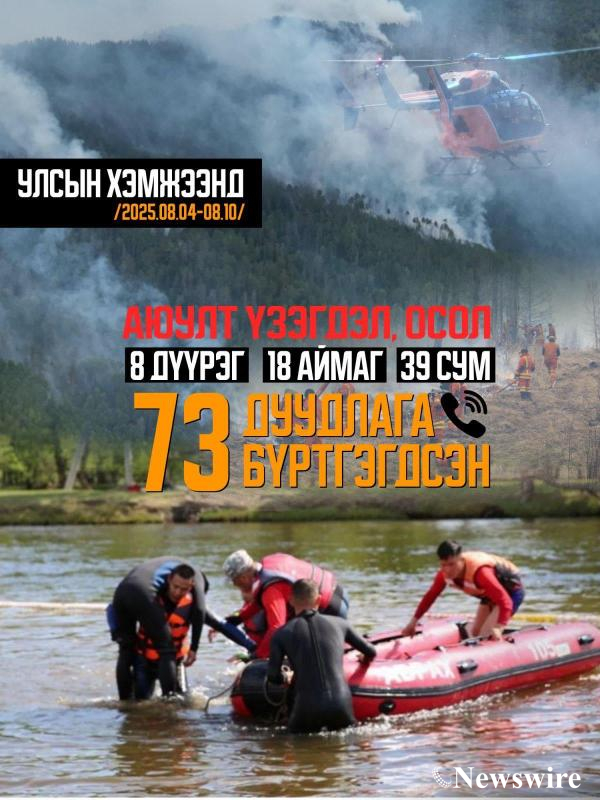 Улсын хэмжээнд өнгөрсөн долоо хоногт /2025.08.04-08.10/ нийслэлийн 8 дүүрэг, 18 аймгийн 39 суманд аюулт үзэгдэл, ослын 73 удаагийн дуудлага бүртгэгдсэн байна.