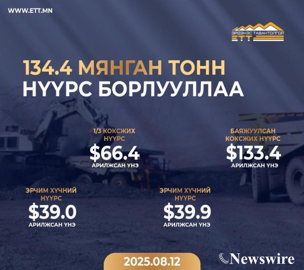 "Эрдэнэс Тавантолгой" ХК 2025 оны 8 дугаар сарын 12-ны өдөр Монголын Хөрөнгийн Биржээр дамжуулан 4 удаагийн арилжаагаар 19.2 мянган тонн баяжуулсан коксжих нүүрс, 64.0 мянган тонн 1/3 коксжих нүүрс, 51.2 мянган тонн эрчим хүчний нүүрс, нийт 134.4 мянган тонн нүүрс БНХАУ-ын Ганцмод боомт хүргэж өгөх нөхцөлөөр амжилттай арилжааллаа.
