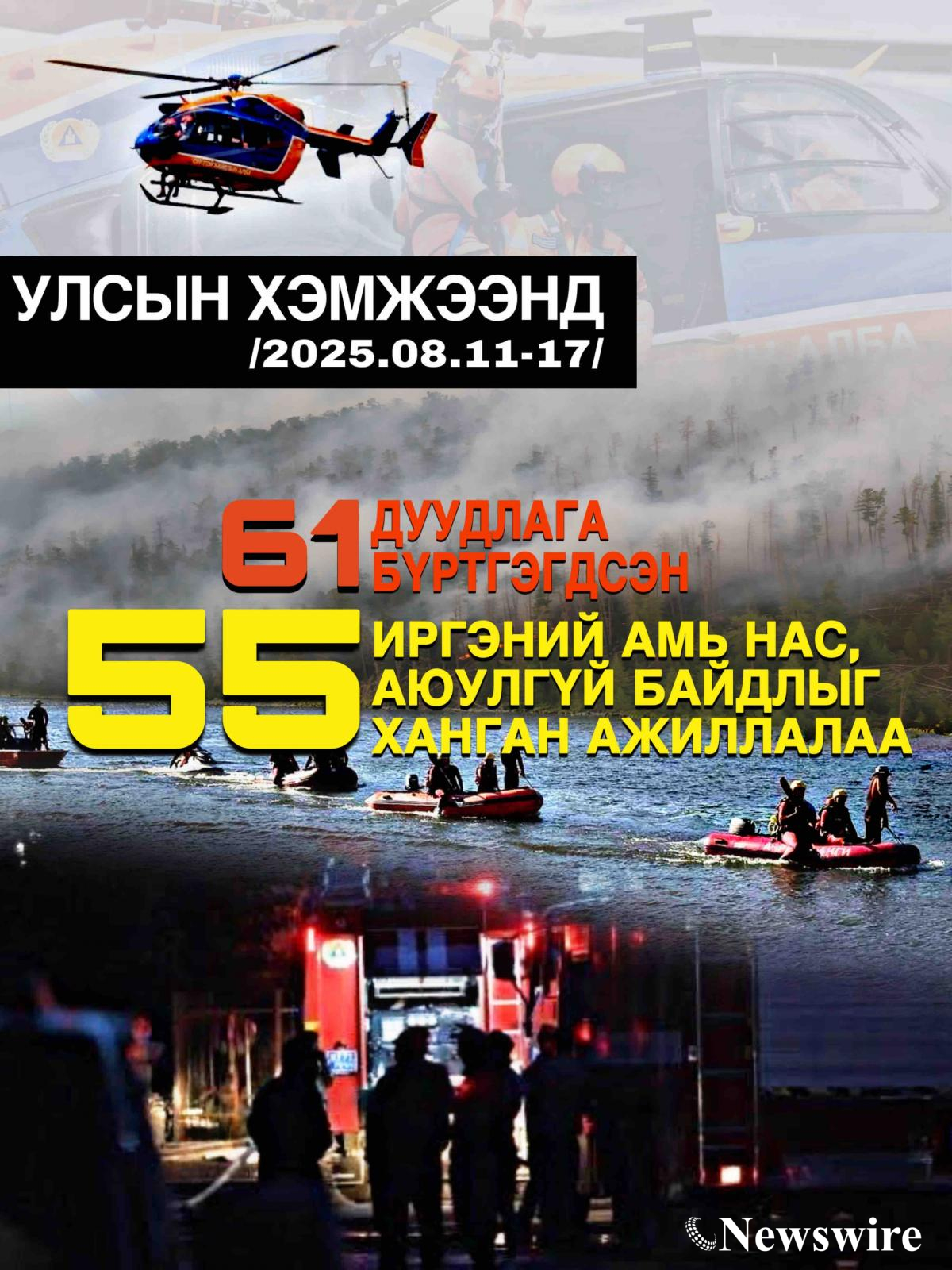Улсын хэмжээнд өнгөрсөн долоо хоногт /2025.08.11-08.17/ нийслэлийн 8 дүүрэг, 15 аймгийн 24 суманд аюулт үзэгдэл, ослын 61 удаагийн дуудлага бүртгэгдлээ.