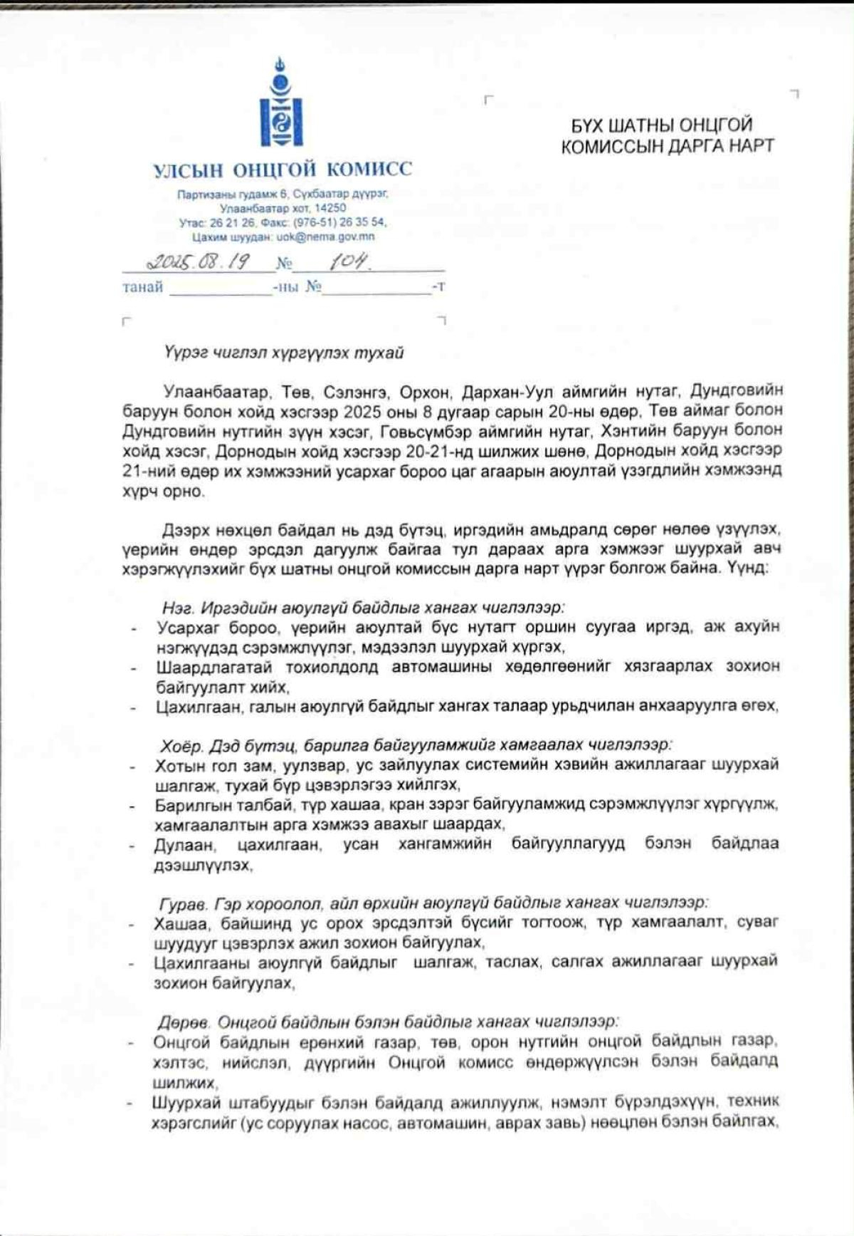 - Шуурхай үед ажиллах алба хаагч, техник хэрэгслийг тодотгох, бэлэн байдлыг хангах чиглэлийн дагуу шуурхай арга хэмжээг хэрэгжүүлэн ажиллаж байна.