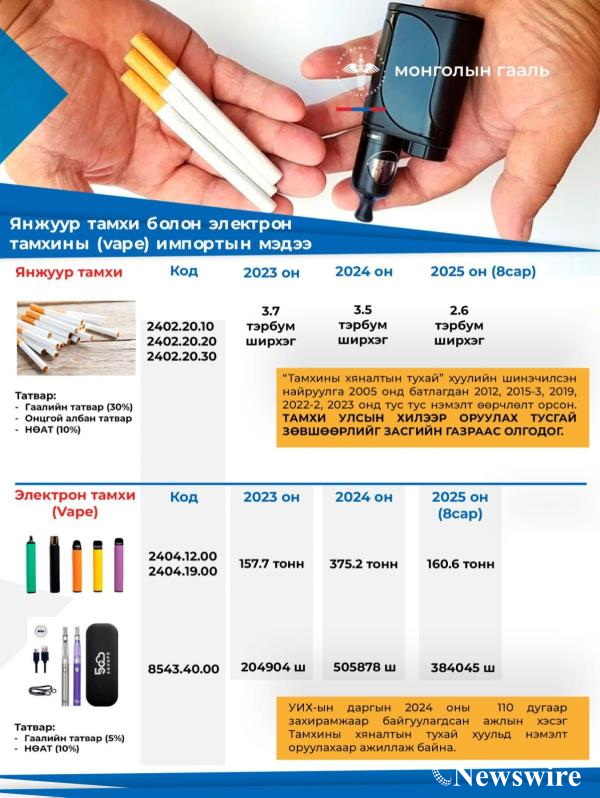 Нэг удаагийн хэрэглээний электрон тамхи, электрон тамхи цэнэглэгч гель болон шингэн, электрон тамхины картриж буюу цэнэглэгч хошуу нь "Тамхи, дахин боловсруулсан тамхи, никотин агуулсан эсвэл никотин орлуулагч агуулсан асаахгүйгээр сорж татах зориулалттай бүтээгдэхүүн"-ий бүлэг буюу 2404.12.00, 2404.19.00 кодуудад ангилагддаг бөгөөд 2023 онд 157.7 тонн, 2024 онд 375.2 тонн, 2025 оны 8 эхний сарын байдлаар 160.6 тонныг импортолсон байна. 2024 онд импортолсон тухайн бүтээгдэхүүнийг өнгөрсөн оны мөн үетэй харьцуулахад 217.5 тонноор буюу 2.3 дахин өсжээ.