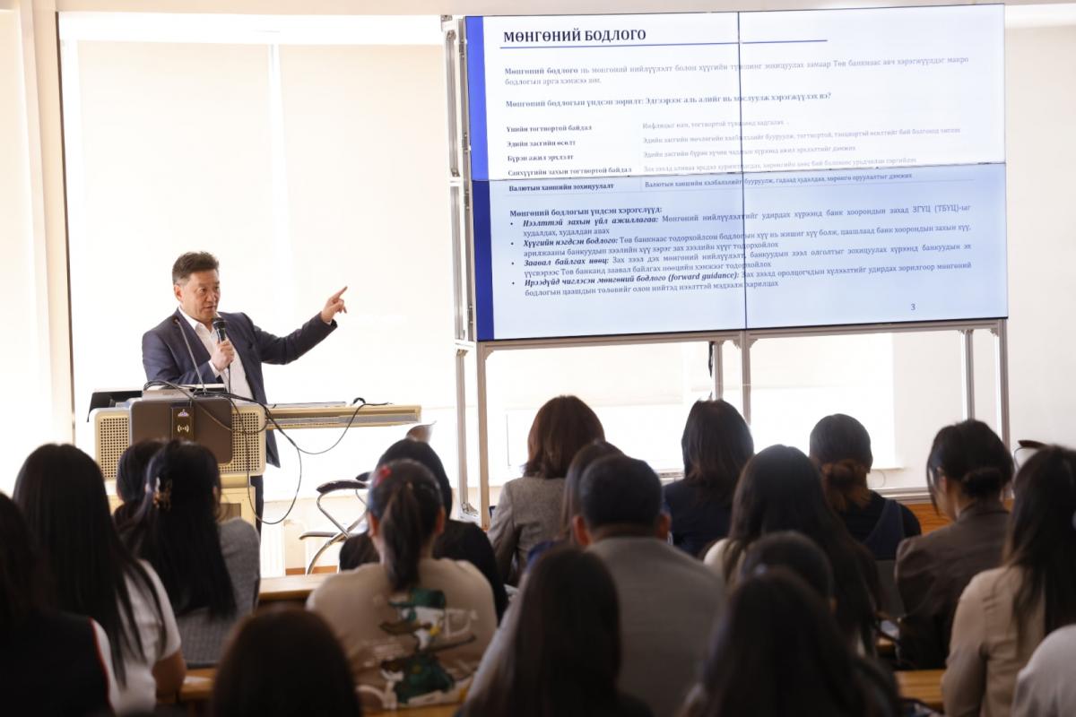 Энэ үеэр Монголбанкны Ерөнхийлөгч Б.Лхагвасүрэн эдийн засгийн төлөв байдал, түүнд мөнгөний бодлогын үзүүлэх нөлөөлөл, онцлог байдал болон Төрөөс мөнгөний бодлогын талаар 2026 онд баримтлах үндсэн чиглэлийн төсөлд тусгагдсан заалтууд, зорилтын талаар дэлгэрэнгүй мэдээлэл өгч, оюутнуудын сонирхсон асуултад хариуллаа.