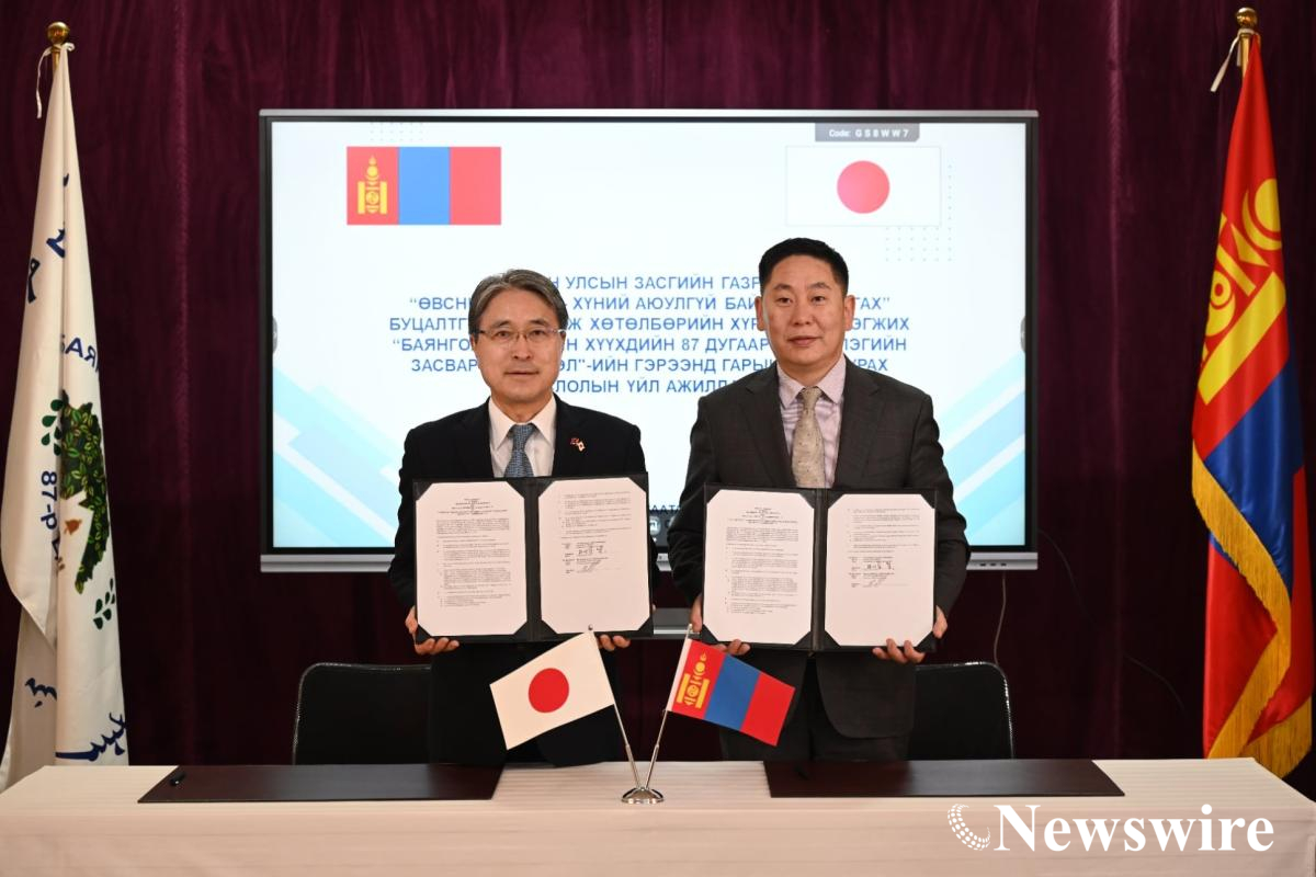 Япон Улсаас Монгол Улсад суугаа Онц бөгөөд Бүрэн эрхт Элчин сайд М.Игавахара болон Баянгол дүүргийн Засаг дарга Ө.Сумъяабаатар нар Япон Улсын Засгийн газрын 2025 оны “Өвсний үндэс-Хүний аюулгүй байдлыг хангах буцалтгүй тусламж”-ийн хөтөлбөрийн хүрээнд хэрэгжих “Улаанбаатар хотын Баянгол дүүргийн 87 дугаар цэцэрлэгийн барилгыг засварлах төсөл”-ийн гэрээнд гарын үсэг зурав.