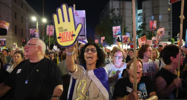 Израилд Газын дайныг зогсоох, барьцаалагдсан иргэдийг суллуулах хэлэлцээр байгуулахыг Ерөнхий сайд Биньямин Нетаньяхугаас шаардан 15 мянга гаруй хүн гудамжинд гарч жагслаа. Мөн Тель-Авив хотод ч олон мянган хүн цугларсан байна.