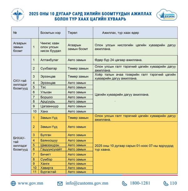 ХИЛИЙН БООМТУУДЫН 2025 ОНЫ 10 ДУГААР САРД АЖИЛЛАХ ЦАГИЙН ХУВААРийг танилцуулж байна.