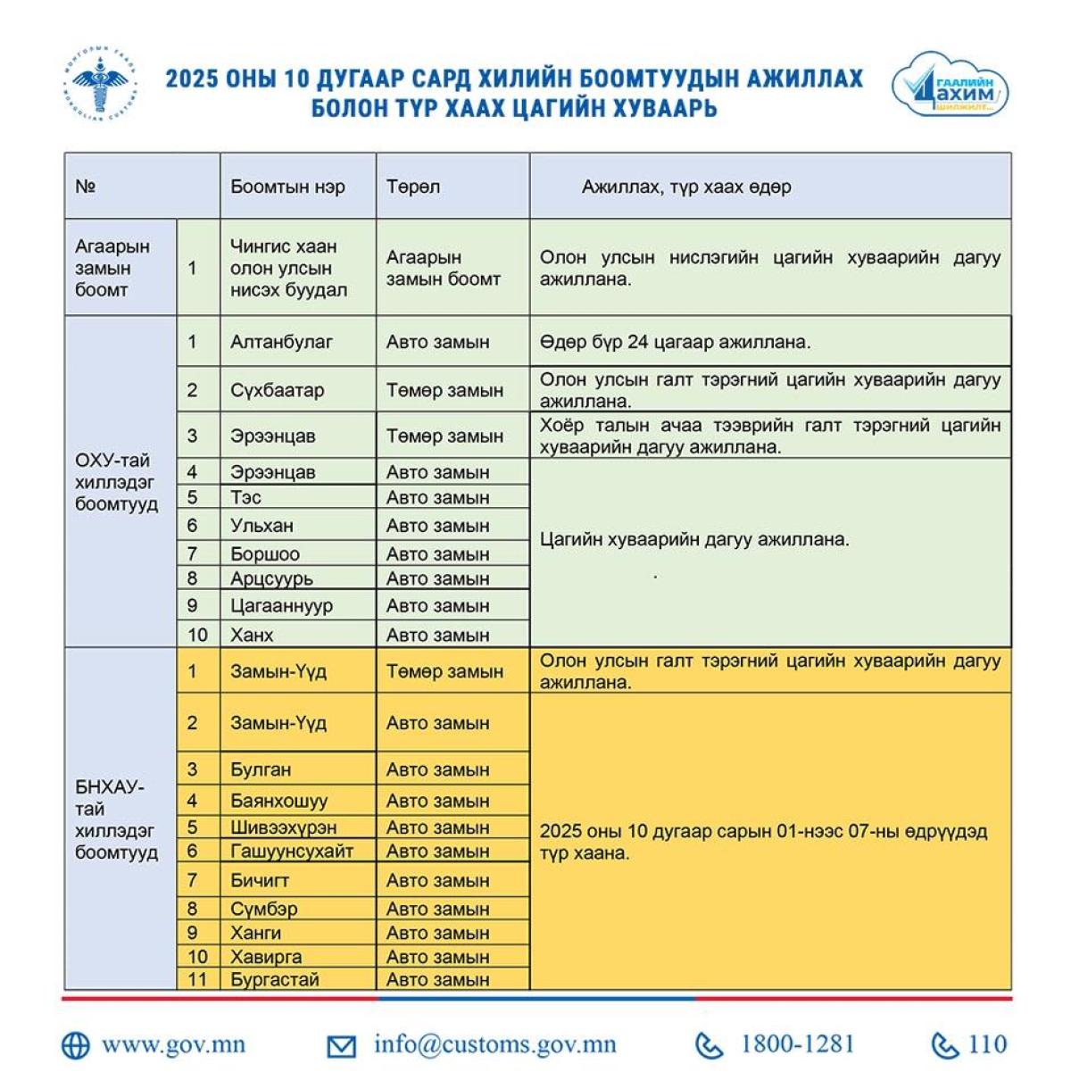 #ГЕГ, #хилийн боомтуудын ажиллах цагийн хуваарь,