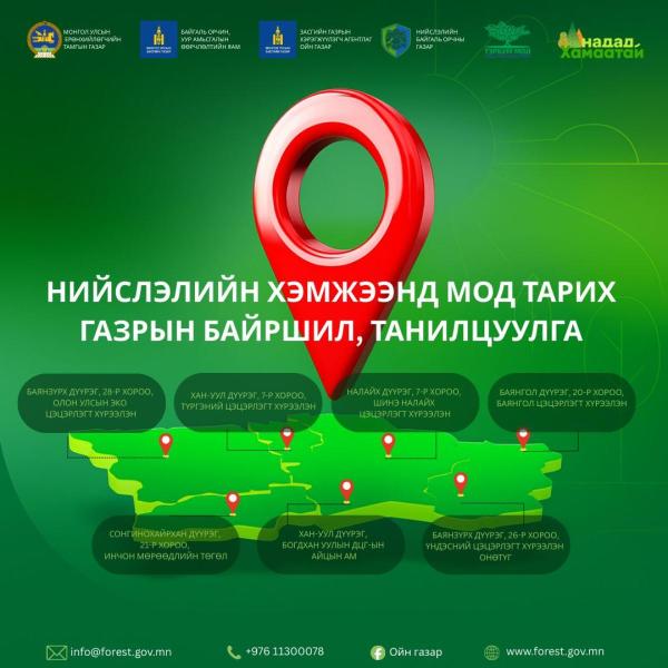 2025 оны намрын мод тарих арга хэмжээг Улаанбаатар хотын хэмжээнд доор дурдсан байршлуудад зохион байгуулна.