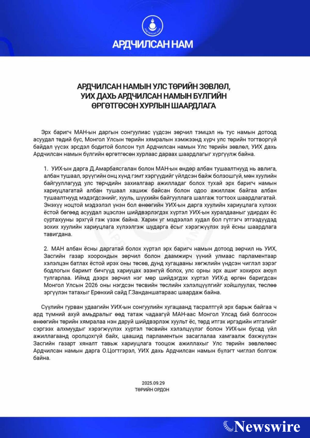 УИХ дахь АН-ын бүлгийн хуралдаан боллоо. АН-ын дарга О.Цогтгэрэл мэдээлэл өглөө.