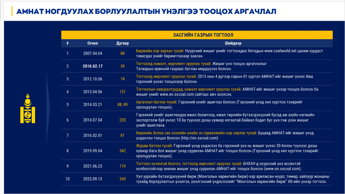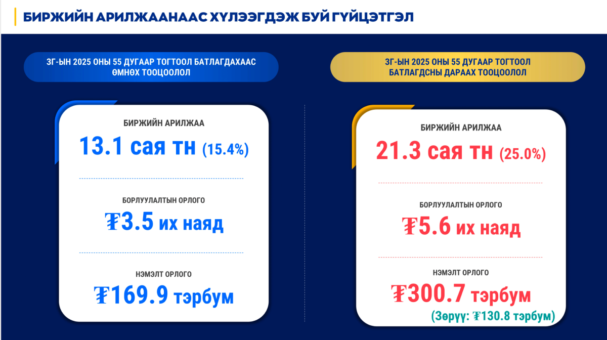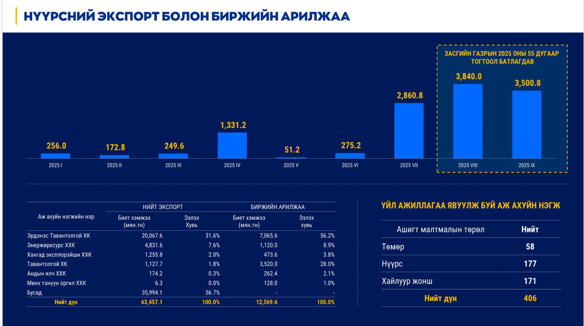 Нэгдүгээрт, бид биржээр арилжаалсан нүүрсийг шахаж, том хэмжээний гэрээнүүдээр нүүрс хилээр гаргаж байсан үйл явдлыг зогсоож, 50 хувь амны гэрээ буюу урт хугацааны гэрээнүүд, 50 хувь биржийн арилжаагаар нүүрснүүдийг экспортлох шийдвэр гаргасан. Үүний үр дүнд биржийн экспорт нэмэгдсэн.