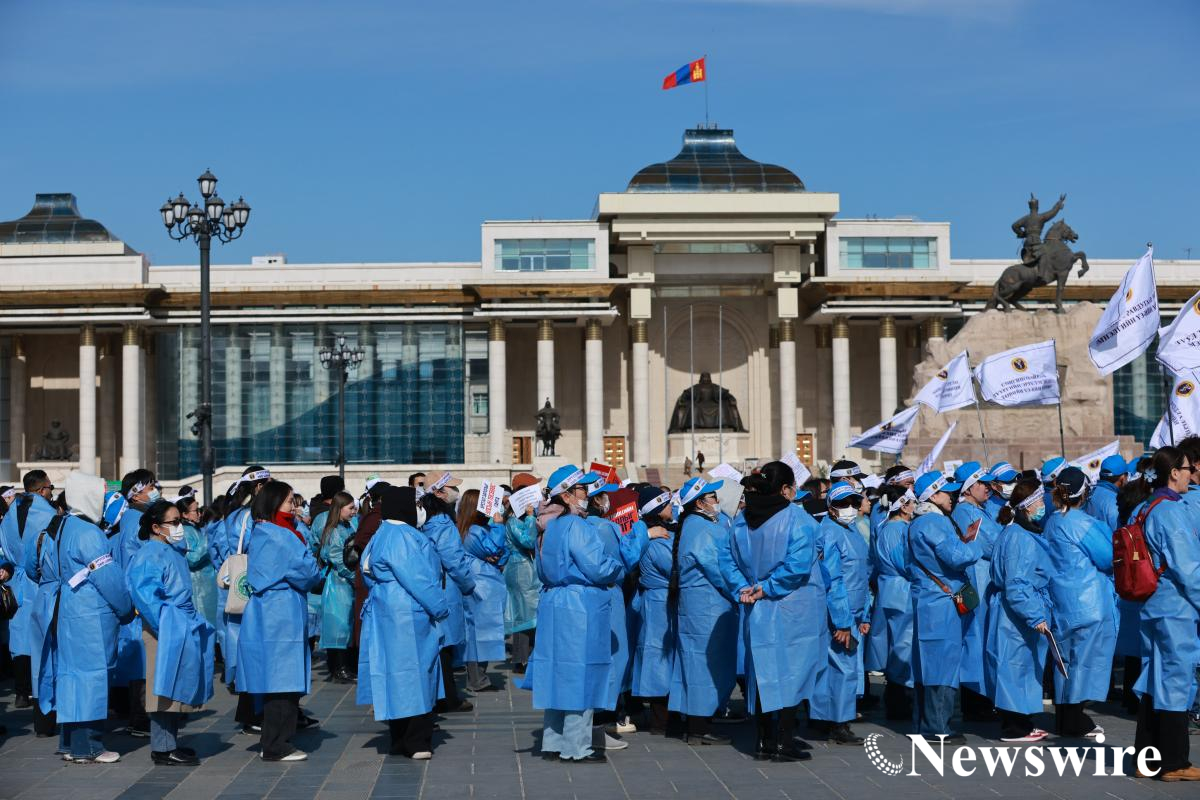 Эрүүл мэндийн салбарын ажилчдын “Зөв шинэчлэлийн төлөө” жагсаал Сүхбаатарын талбайд болж байна.