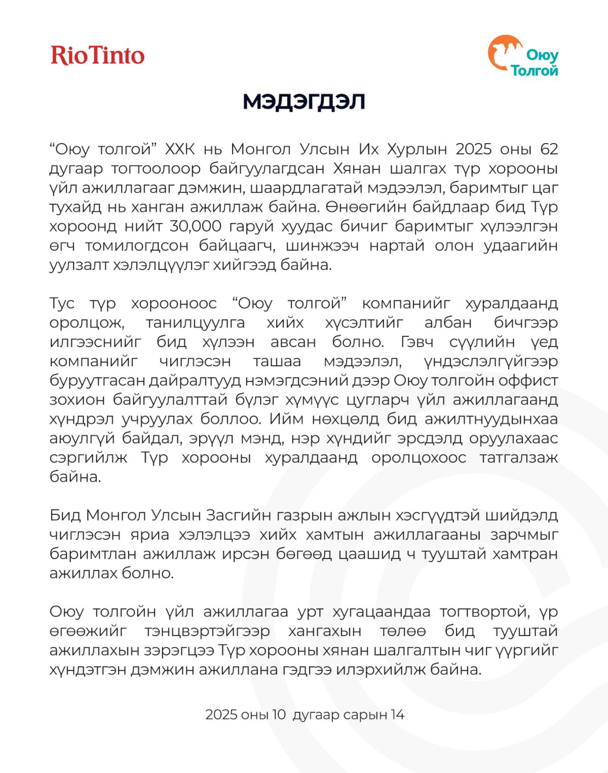 Тус мэдэгдэлд "Оюу толгой" ХХК нь Монгол Улсын Их Хурлын 2025 оны 62 дугаар тогтоолоор байгуулагдсан Хянан шалгах түр хорооны үйл ажиллагааг дэмжин, шаардлагатай мэдээлэл, баримтыг цаг
