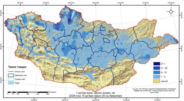 Ус цаг уур, орчны судалгаа мэдээллийн хүрээлэнгээс арав хоногт нэг удаа хийдэг хээрийн цасны хэмжилтийн мэдээгээр аравдугаар сарын 20–ны байдлаар нийт нутгийн 46 хувьд цастай байна.