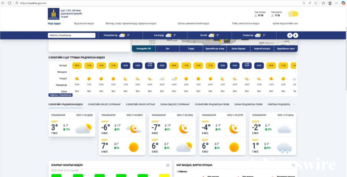 Цаг уур, орчны шинжилгээний газар (ЦУОШГ) нь хот, суурины 3 хоногийн цаг агаарын урьдчилсан мэдээг өмнө нь 12 цагийн нарийвчлалтайгаар хүргэдэг байснаа 3 цаг болгон шинэчиллээ. /www.weather.gov.mn/