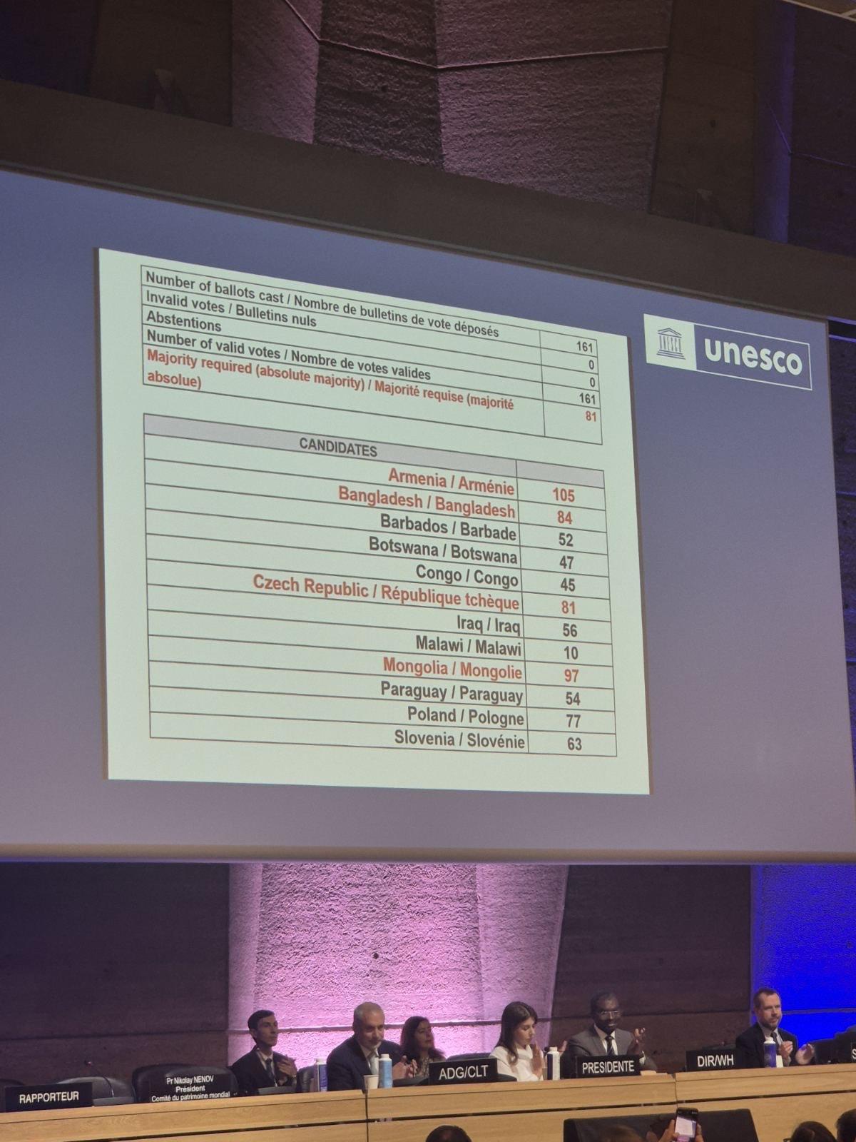 Бүгд Найрамдах Франц Улсын нийслэл Парис хотноо энэ 11 дүгээр сарын 24-ний өдөр хуралдсан Дэлхийн өвийн конвенцын Талуудын 25 дугаар Ерөнхий Ассамблейн чуулганаар Монгол Улс ЮНЕСКО-гийн Дэлхийн өвийн хорооны гишүүнээр анх удаа сонгогдлоо.