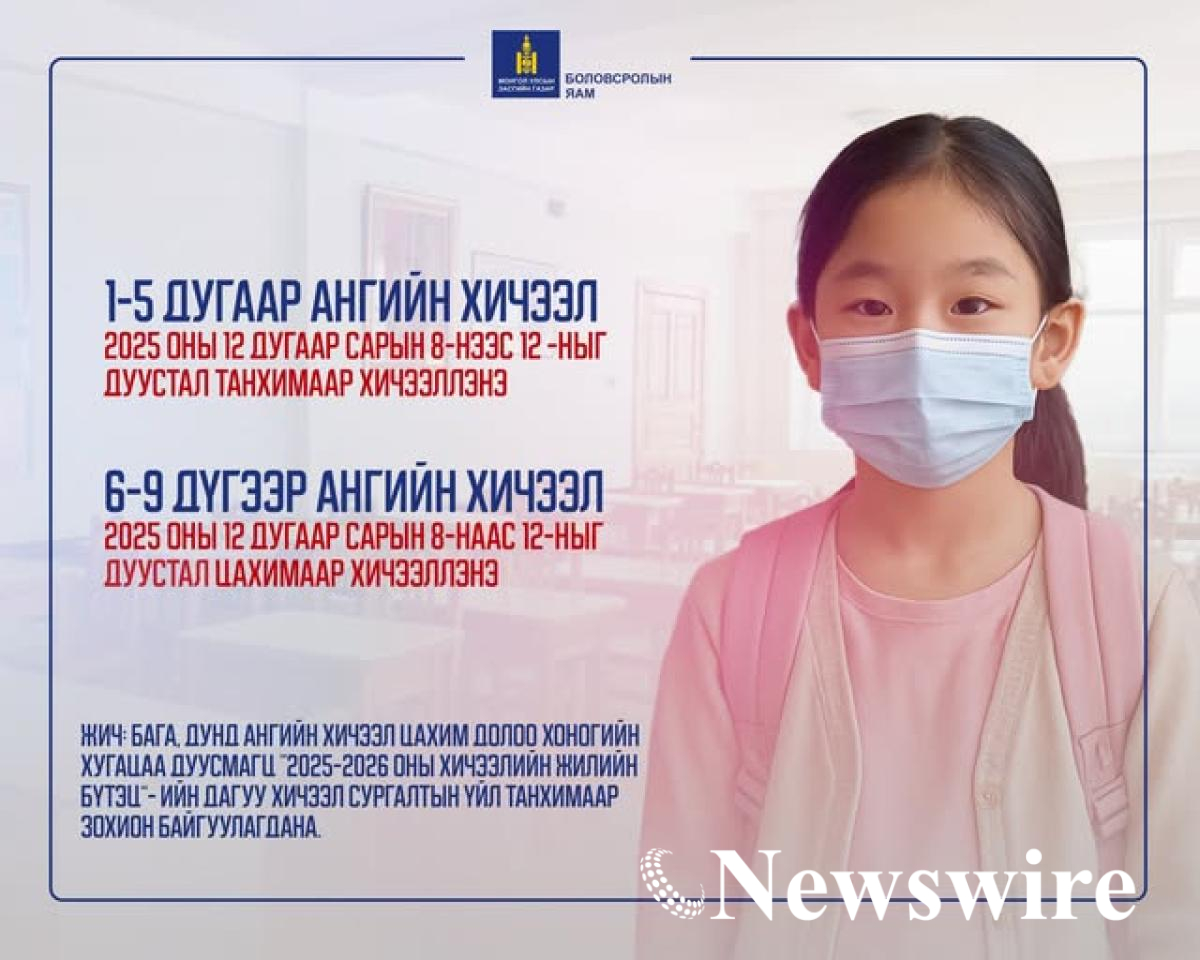 Жич: Бага, дунд ангийн хичээл цахим долоо хоногийн хугацаа дуусмагц “2025-2026 оны хичээлийн жилийн бүтэц”- ийн дагуу хичээл сургалтын үйл танхимаар зохион байгуулагдана гэж Боловсролын яамнаас мэдээллээ.