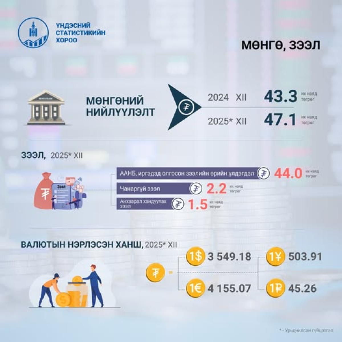Mөнгөний нийлүүлэлт (M2) 2025 оны 12 дугаар сарын эцэст урьдчилсан гүйцэтгэлээр 47.1 их наяд төгрөгт хүрч, өмнөх оноос 3.8 (8.7%) их наяд төгрөгөөр өсөхөд төгрөгийн хадгаламж 4.0 (18.3%) их наяд төгрөгөөр өссөн нь голлон нөлөөлжээ.