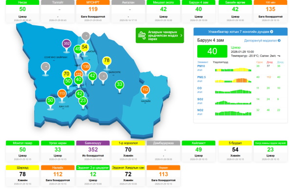 Нисэх, Мишээл экспо, Богд хааны ордон музей, 5 буудал, Бөхийн өргөө, Ургах наран, Монгол газар, Хайлааст, Баруун 4 зам орчмын агаарын чанарын индекс цэвэр байна.