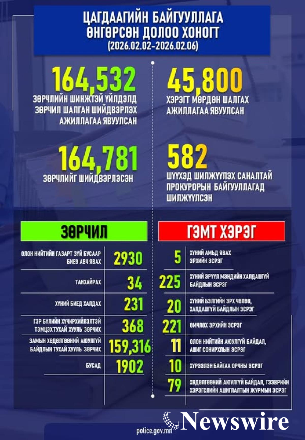 Цагдаагийн байгууллагаас 2026 оны 01 дүгээр сард 45,800 хэрэгт мөрдөн шалгах ажиллагааг явуулж, өнгөрсөн долоо хоногт (2026.02.02-оос 2026 оны 02 дугаар сарын 06-ны өдрүүдэд) 582 хэргийг шүүхэд шилжүүлэх саналтай прокурорын байгууллагад хүргүүлсэн байна.