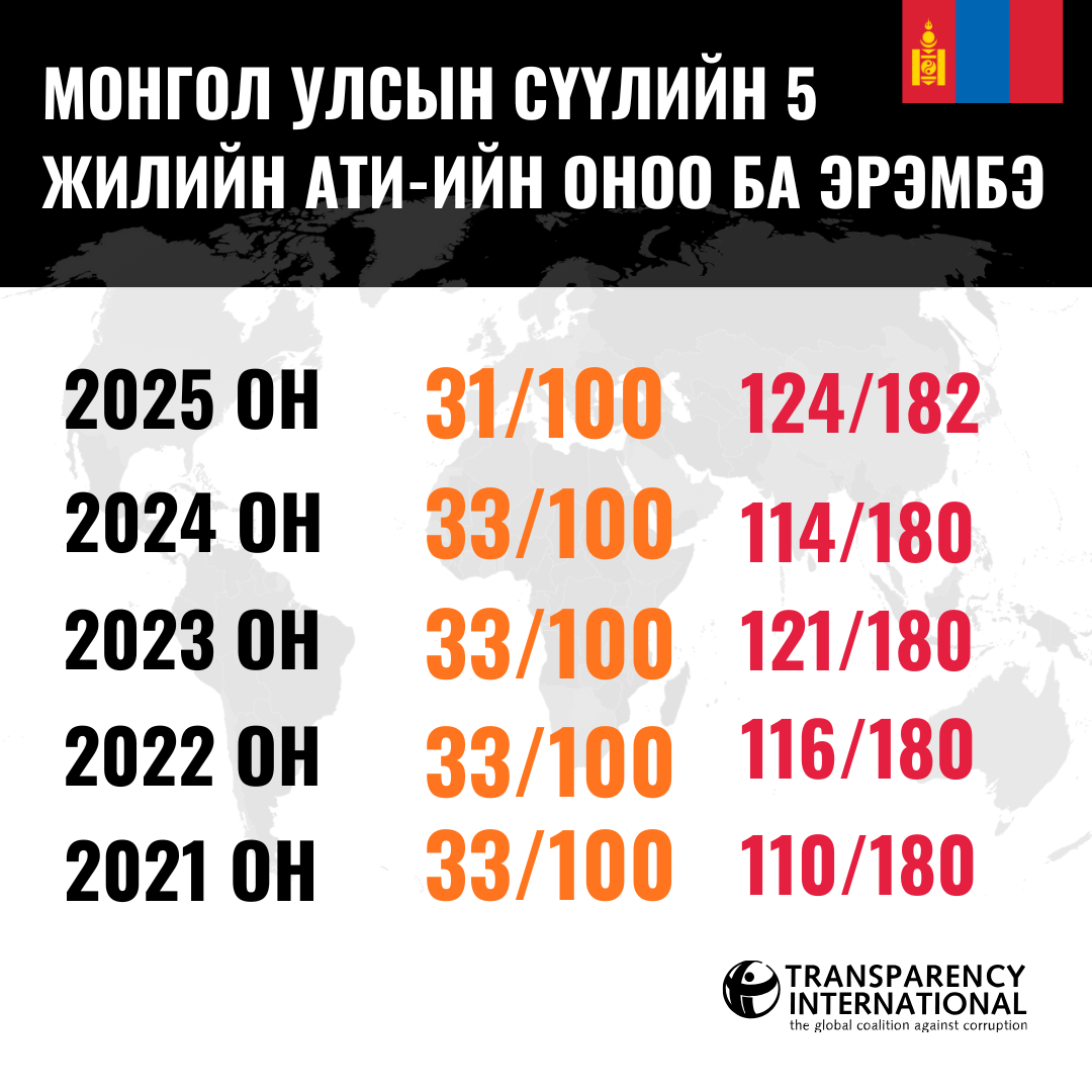 Монгол Улс 2025 оны АТИ-д 31 оноо авч, 182 улсаас 124-т эрэмбэлэгдлээ.