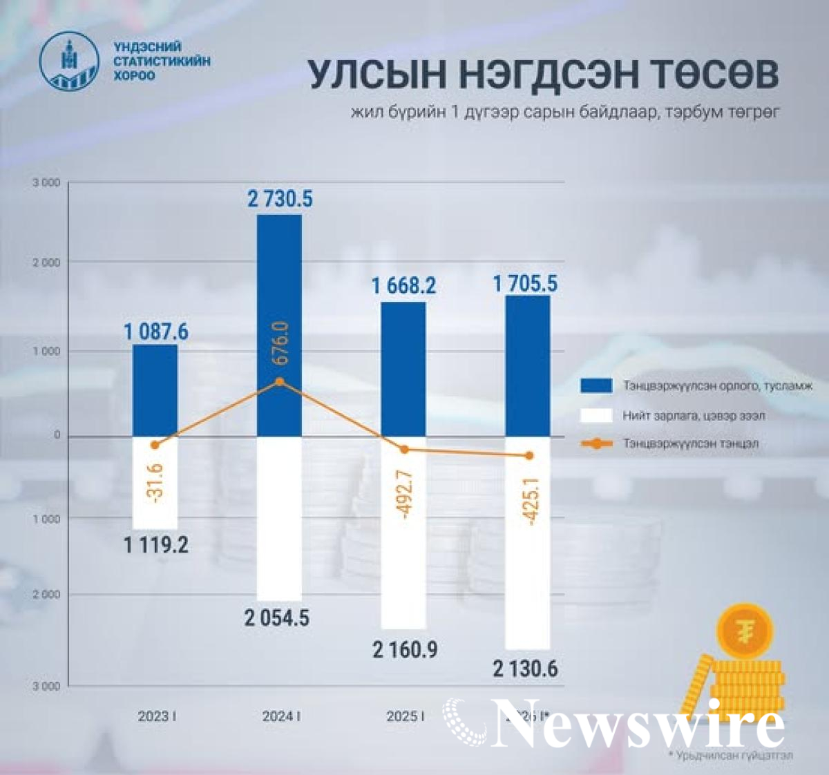 Улсын нэгдсэн төсвийн нийт орлого, тусламжийн хэмжээ 2026 оны 1 дүгээр сарын урьдчилсан гүйцэтгэлээр 1.8 их наяд төгрөгт хүрч, өмнөх оны мөн үеэс 78.2 (4.5%) тэрбум төгрөг, тэнцвэржүүлсэн орлого тусламжийн хэмжээ 1.7 их наяд төгрөгт хүрч, өмнөх оны мөн үеэс 37.4 (2.2%) тэрбум төгрөгөөр тус тус өсжээ.